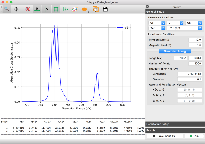 Crispy is a modern graphical user interface to calculate core-level spectra using the semi-empirical multiplet approaches implemented in Quanty. The interface provides a set of tools to generate input files, submit calculations, and plot the resulting spectra. You can find more information on the official website.