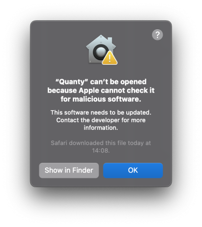 In recent versions of MacOS apple warns when you try to start an app that is downloaded from the internet and made by a developer that is not signed by apple. If you trust the Quanty development team you can circumvent this warning by finding the app in finder and press the control key whilst right clicking the app with your mouse. This will open a screen with the question if you really want to open the app. Click yes and from now on you should be able to run Quanty from within the terminal. If you want more information you can also click on the question mark button on the right top of the warning screen. This will open the following information screen from the Mac OS User guide.