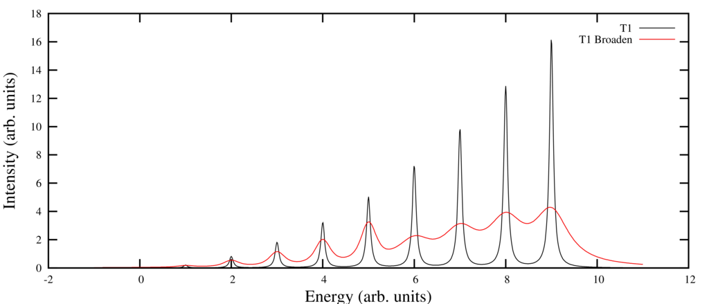 dofile("definitions.Quanty") -- Broaden with a Gaussian of FWHM 0.2 and a Lorenzian with variable -- width, the interval 0 to 5.25 has FWHM=0.2. The interval 5.75,20 has -- FWHM=0.75. The interval 5.25 to 5.75 linearly increases from 0.2 to 0.75 GBroaden = Spectra.Broaden(G, 0.2, {{0.0,0.2}, {5.25,0.2}, {5.75,0.75}, {20.0,0.75}}) G.Print({{"file","Spectra.dat"}}) GBroaden.Print({{"file","Spectra.Broaden.dat"}}) gnuplotScript = gnuplotHead .. [[ set output "Spectra.Broaden.ps" plot "Spectra.dat" using 1:(-$3 ) title 'T1' with lines ls 1,\ "Spectra.Broaden.dat" using 1:(-$3*2) title 'T1 Broaden' with lines ls 2 ]] file = io.open("Spectra.Broaden.gnuplot", "w") file:write(gnuplotScript) file:close() os.execute("gnuplot Spectra.Broaden.gnuplot") os.execute("convert -density 1024 Spectra.Broaden.ps -resize 1024 Spectra.Broaden.png")