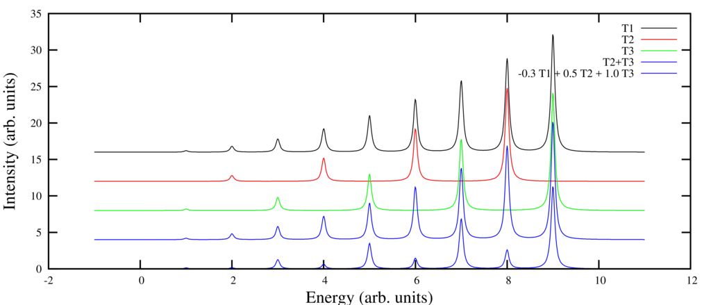 dofile("definitions.Quanty") G2plus3 = Spectra.Sum(G,{0,1,1},{-0.3,0.5,1.0}) G.Print({{"file","Spectra.dat"}}) G2plus3.Print({{"file","Spectra.Sum.dat"}}) gnuplotScript = gnuplotHead .. [[ set output "Spectra.Sum.ps" plot "Spectra.dat" using 1:(-$3+16) title 'T1' with lines ls 1,\ "Spectra.dat" using 1:(-$5+12) title 'T2' with lines ls 2,\ "Spectra.dat" using 1:(-$7+8 ) title 'T3' with lines ls 3,\ "Spectra.Sum.dat" using 1:(-$3+4 ) title 'T2+T3' with lines ls 4,\ "Spectra.Sum.dat" using 1:(-$5 ) title '-0.3 T1 + 0.5 T2 + 1.0 T3' with lines ls 4 ]] file = io.open("Spectra.Sum.gnuplot", "w") file:write(gnuplotScript) file:close() os.execute("gnuplot Spectra.Sum.gnuplot") os.execute("convert -density 1024 Spectra.Sum.ps -resize 1024 Spectra.Sum.png")