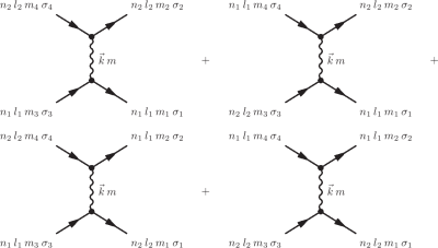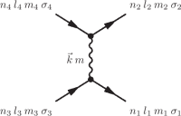 Using Feynman diagrams this interaction can be depicted as two electrons entering with quantum numbers $\tau_4$ and $\tau_3$, exchanging an entity $\kappa$ and leaving with quantum numbers $\tau_1$ and $\tau_2$.
