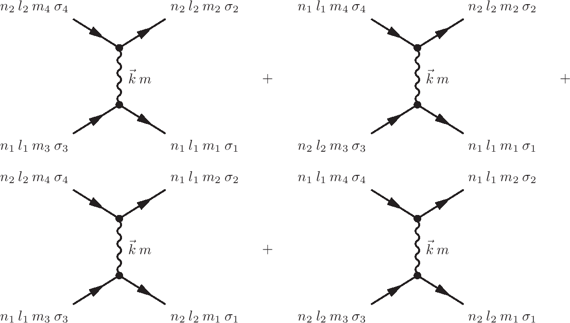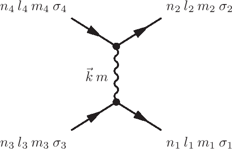 Using Feynman diagrams this interaction can be depicted as two electrons entering with quantum numbers $\tau_4$ and $\tau_3$, exchanging an entity $\kappa$ and leaving with quantum numbers $\tau_1$ and $\tau_2$.