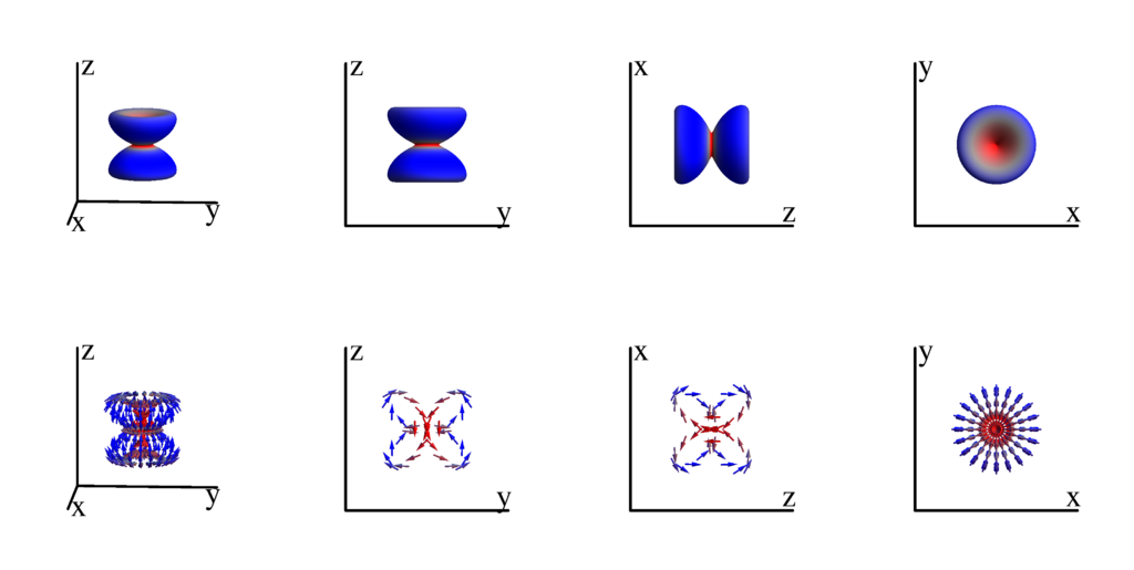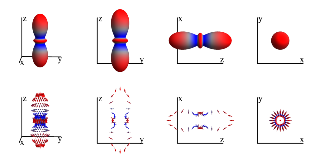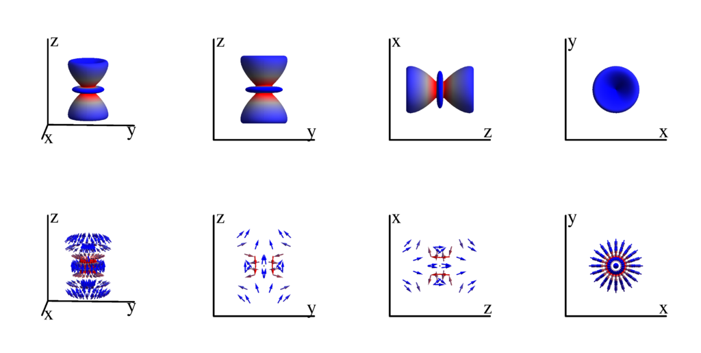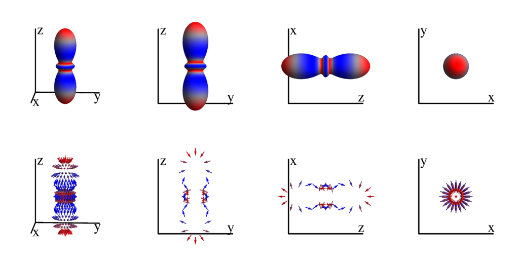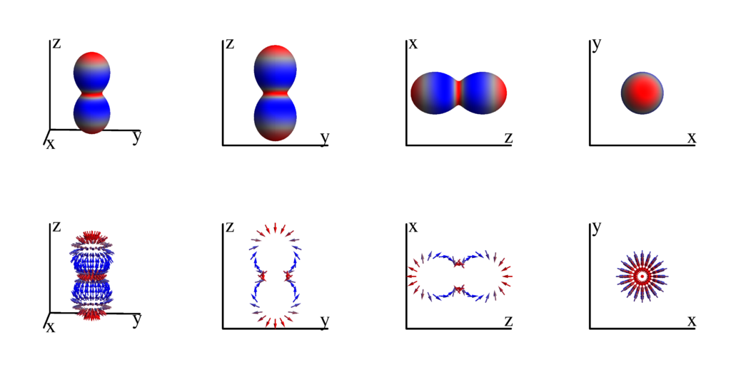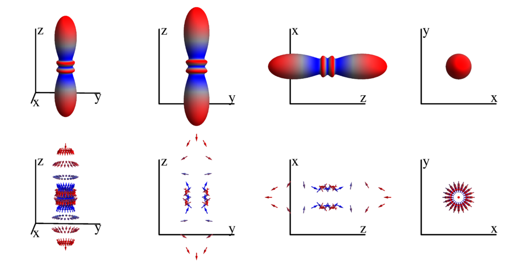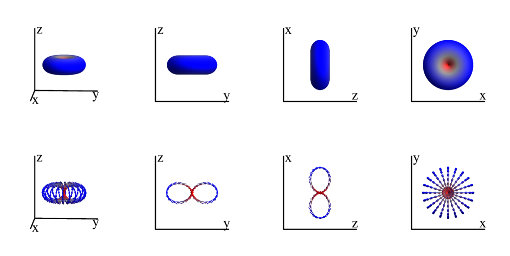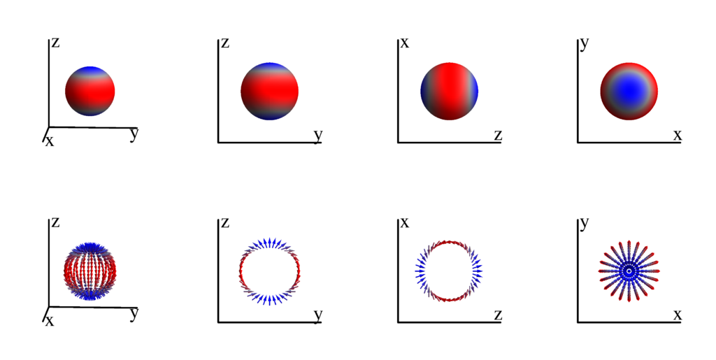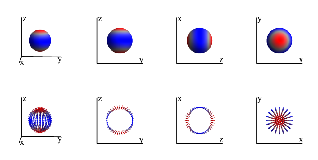 The following table shows the $J_{l,j}^{(j_z})$ states. We order them first according to $l$. For each $l$ we first list the states with $j=l-1/2$ and then the states with $j=l+1/2$. Within each $j$ shell we order the states from $j_z=-j$ to $j_z=j$. In the plots we show in the top row the surface given by the equation $r={J_{l,j}^{(j_z)}}^* \cdot J_{l,j}^{(j_z)}$ where the $\cdot$ refers to a normal dot-product of vectors. The color is according to the spin with red relating to spin-up and blue to spin-down. The vector $\{1,0\}$ would thus show as a red sphere, the vector $\{0,1\}$ as a blue sphere and the vector $\{\sqrt{1/2},\sqrt{1/2}\}$ as a grey sphere. All spheres in this example would have the same radius 1. We show a 3D image as well as a projection along the $x$, $y$ and $z$ direction. In the second row we show a plot of $\vec{S}(x,y,z)$. This is a vector with length $1/2$ which direction varies in space. We show the vectors on the same surface and using the came color scheme as shown in the top row. For the x and y projection we only show the plane with $x=0$ or $y=0$ respectively.
