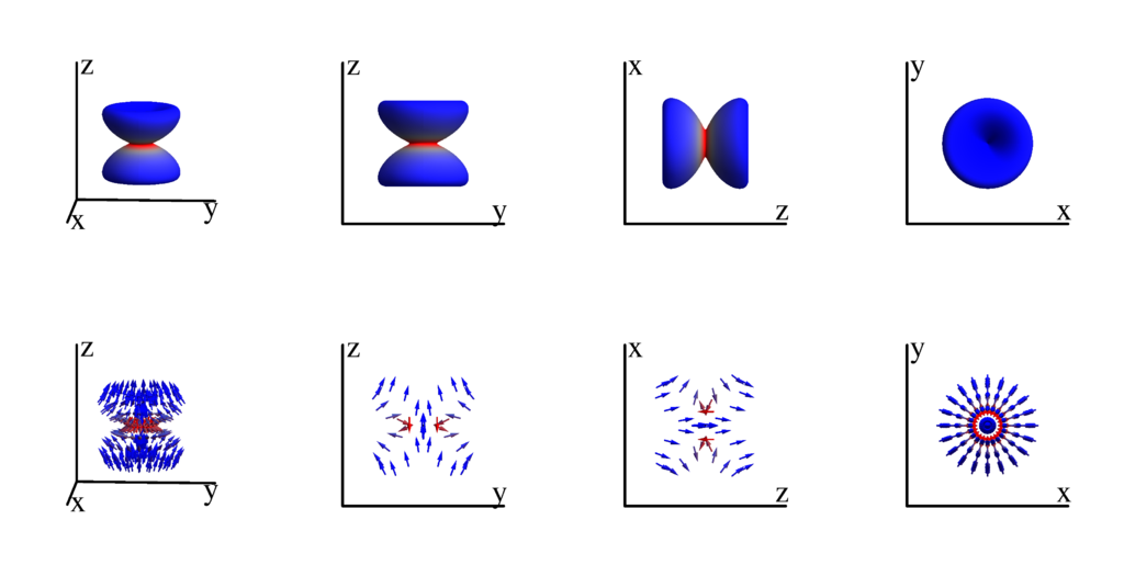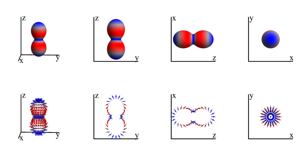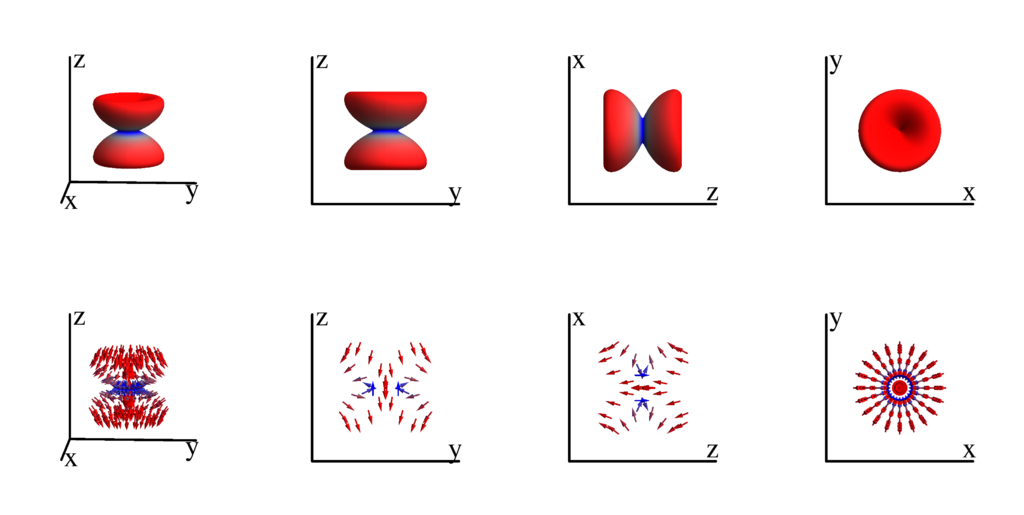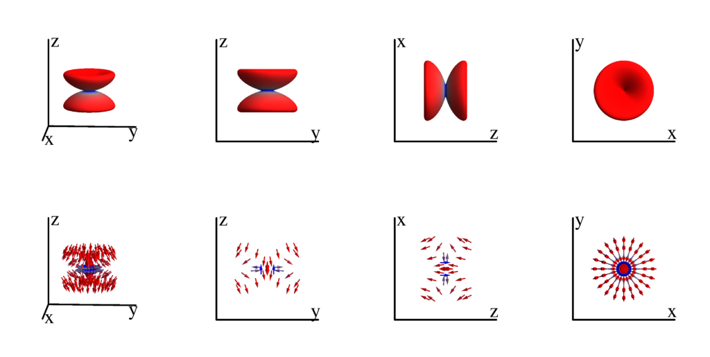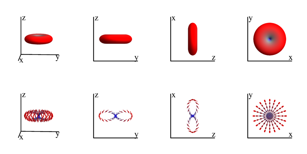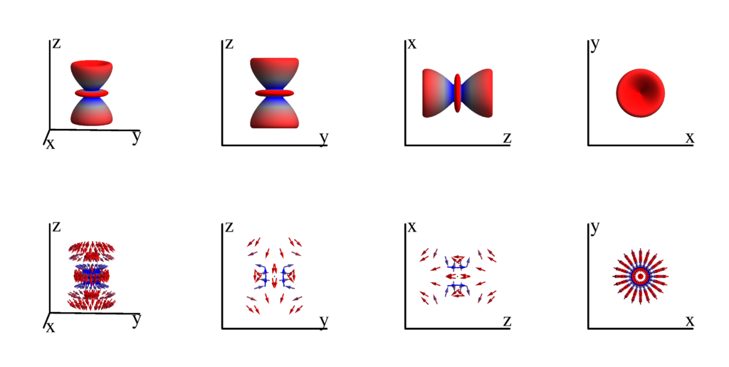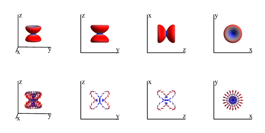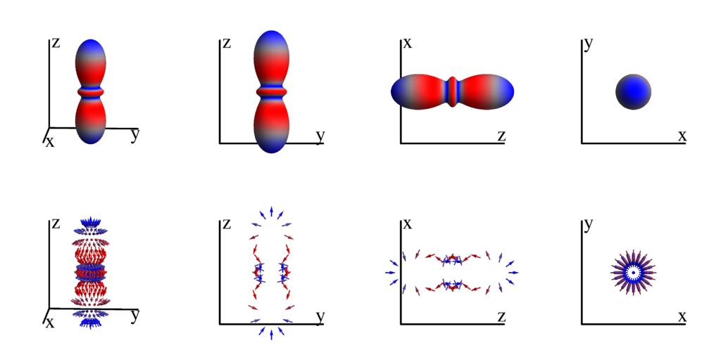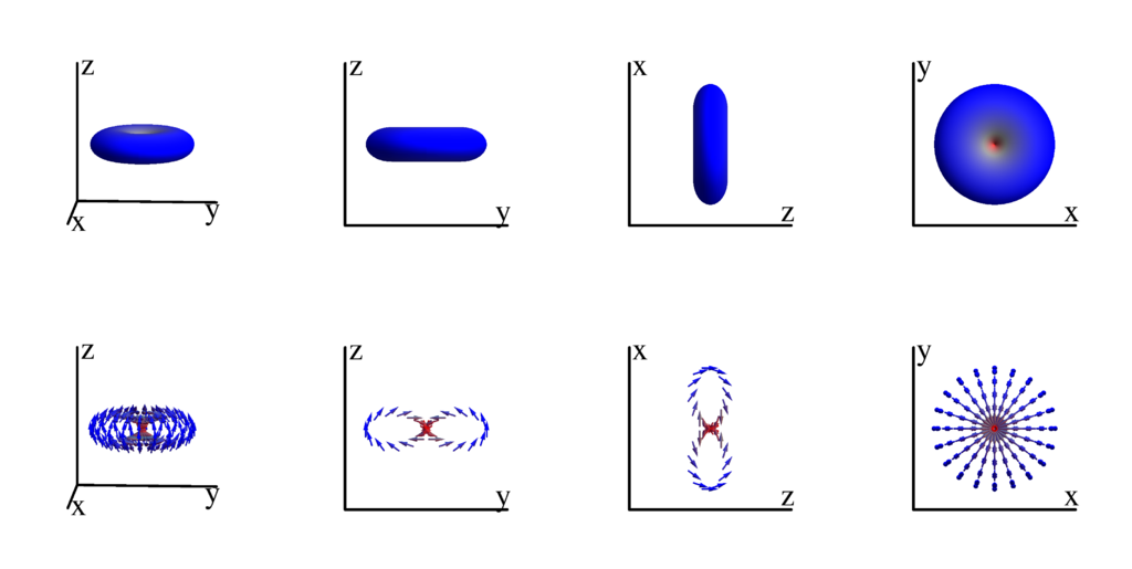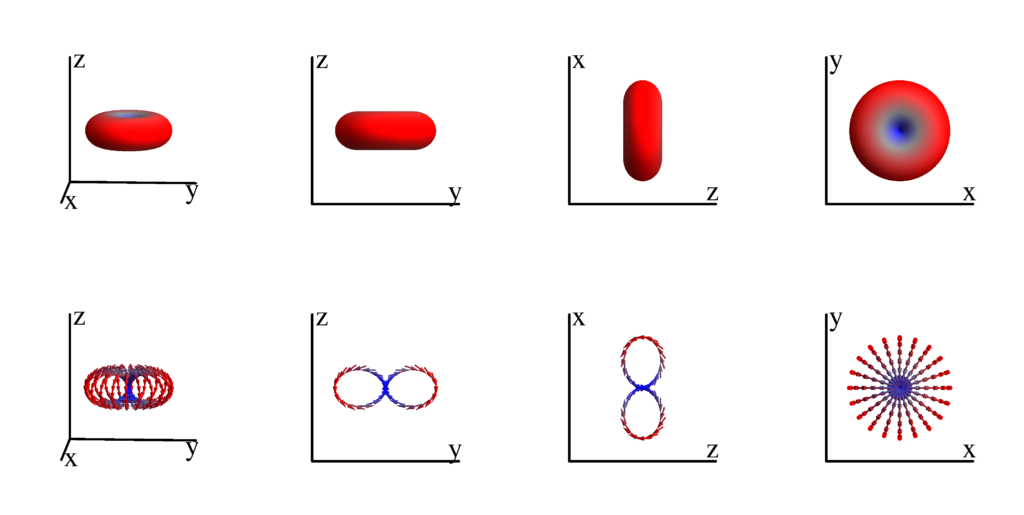 The following table shows the $J_{l,j}^{(j_z})$ states. We order them first according to $l$. For each $l$ we first list the states with $j=l-1/2$ and then the states with $j=l+1/2$. Within each $j$ shell we order the states from $j_z=-j$ to $j_z=j$. In the plots we show in the top row the surface given by the equation $r={J_{l,j}^{(j_z)}}^* \cdot J_{l,j}^{(j_z)}$ where the $\cdot$ refers to a normal dot-product of vectors. The color is according to the spin with red relating to spin-up and blue to spin-down. The vector $\{1,0\}$ would thus show as a red sphere, the vector $\{0,1\}$ as a blue sphere and the vector $\{\sqrt{1/2},\sqrt{1/2}\}$ as a grey sphere. All spheres in this example would have the same radius 1. We show a 3D image as well as a projection along the $x$, $y$ and $z$ direction. In the second row we show a plot of $\vec{S}(x,y,z)$. This is a vector with length $1/2$ which direction varies in space. We show the vectors on the same surface and using the came color scheme as shown in the top row. For the x and y projection we only show the plane with $x=0$ or $y=0$ respectively.