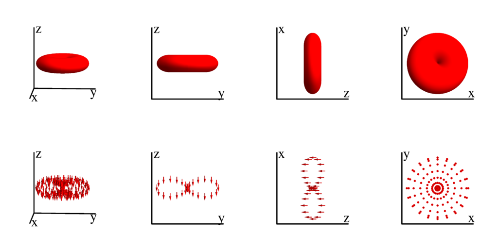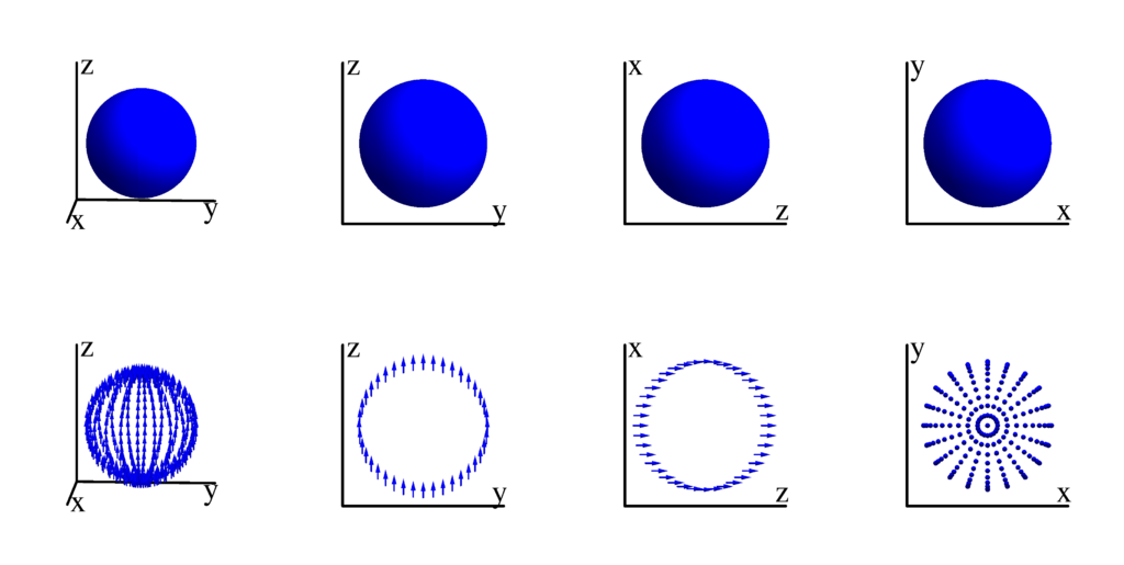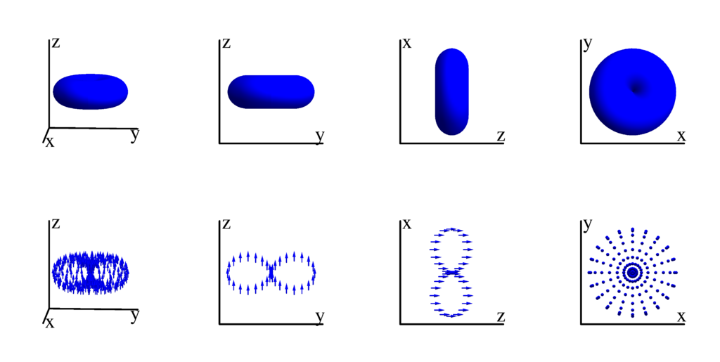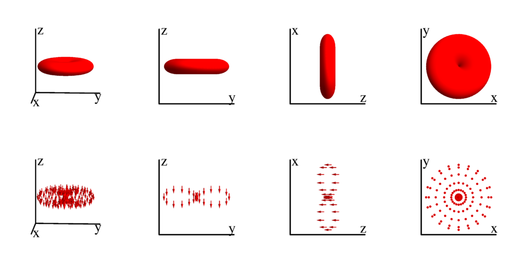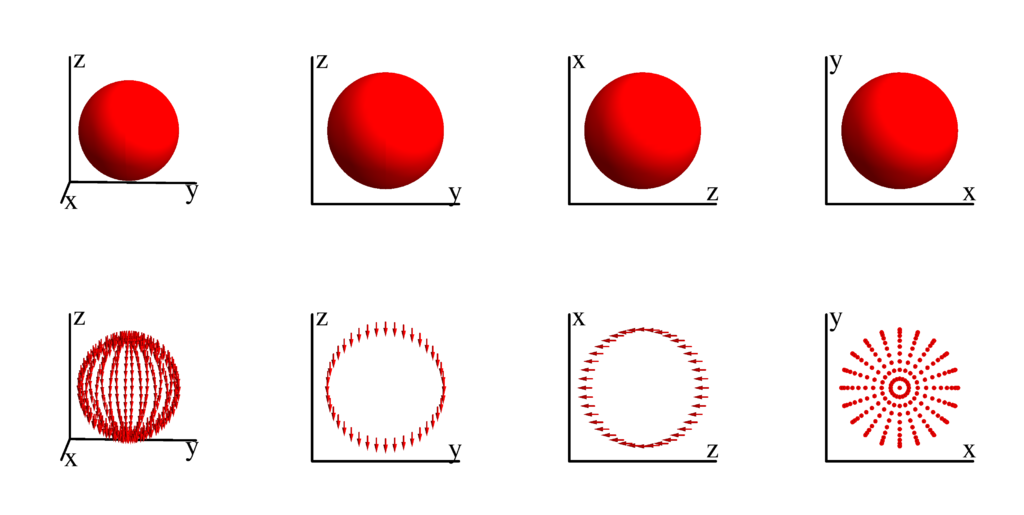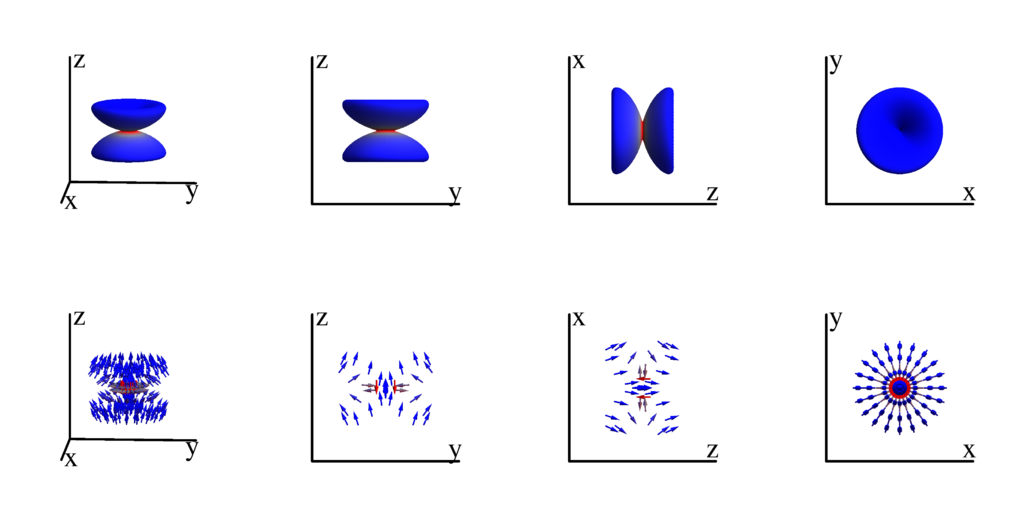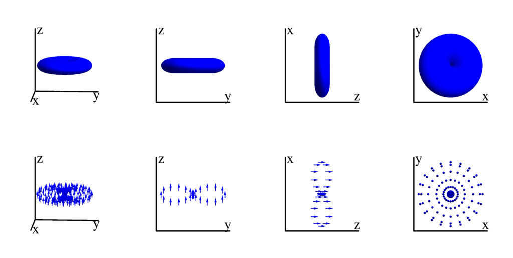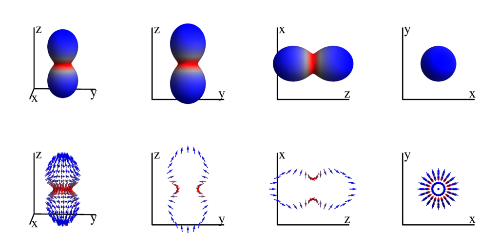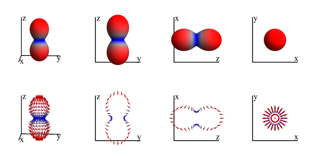 The following table shows the $J_{l,j}^{(j_z})$ states. We order them first according to $l$. For each $l$ we first list the states with $j=l-1/2$ and then the states with $j=l+1/2$. Within each $j$ shell we order the states from $j_z=-j$ to $j_z=j$. In the plots we show in the top row the surface given by the equation $r={J_{l,j}^{(j_z)}}^* \cdot J_{l,j}^{(j_z)}$ where the $\cdot$ refers to a normal dot-product of vectors. The color is according to the spin with red relating to spin-up and blue to spin-down. The vector $\{1,0\}$ would thus show as a red sphere, the vector $\{0,1\}$ as a blue sphere and the vector $\{\sqrt{1/2},\sqrt{1/2}\}$ as a grey sphere. All spheres in this example would have the same radius 1. We show a 3D image as well as a projection along the $x$, $y$ and $z$ direction. In the second row we show a plot of $\vec{S}(x,y,z)$. This is a vector with length $1/2$ which direction varies in space. We show the vectors on the same surface and using the came color scheme as shown in the top row. For the x and y projection we only show the plane with $x=0$ or $y=0$ respectively.