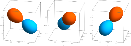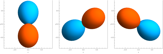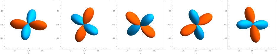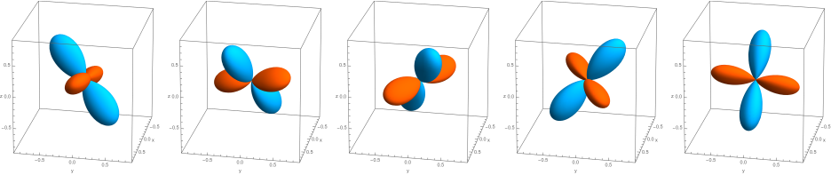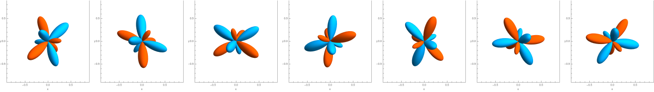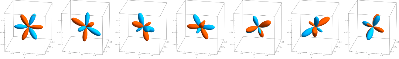 From the Tesseral Harmonics and for a given angular momentum $l$ one can construct an orbital basis where the basis orbitals have the same shape, but differ in orientation. This implies that this basis can be obtained by specifying one of these orbitals and obtain the others by rotating the first one. A possible realization is to align these orbitals along the slant edges of a pyramid with a regular polygon of order $2l+1$ as base [1,2]. Hence, the name “Pyramidal Harmonics”. Below we show these for $l=0...3$, but this can be done for every $l$. The first row depicts the view from the side, the second row depicts the view from the top along the z-axis.