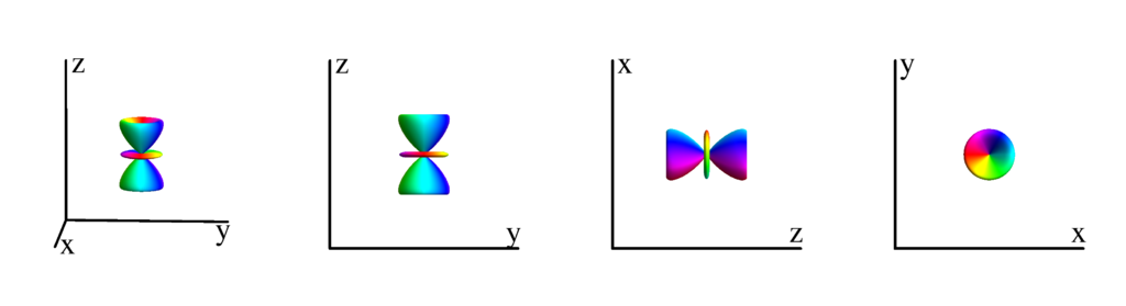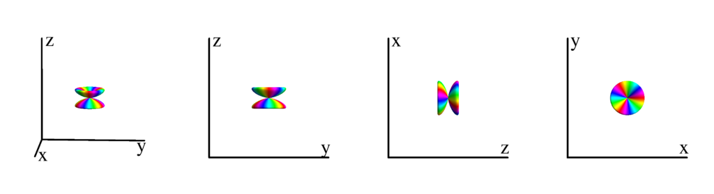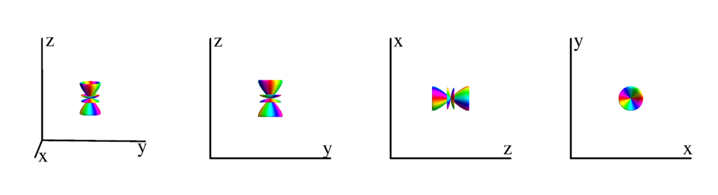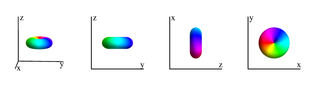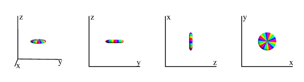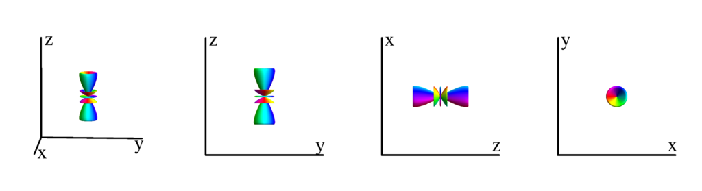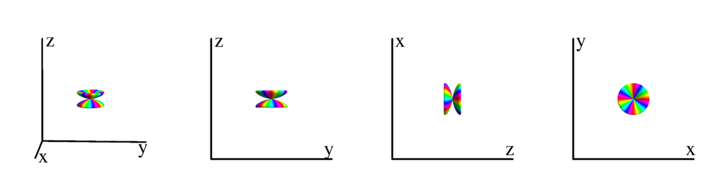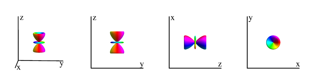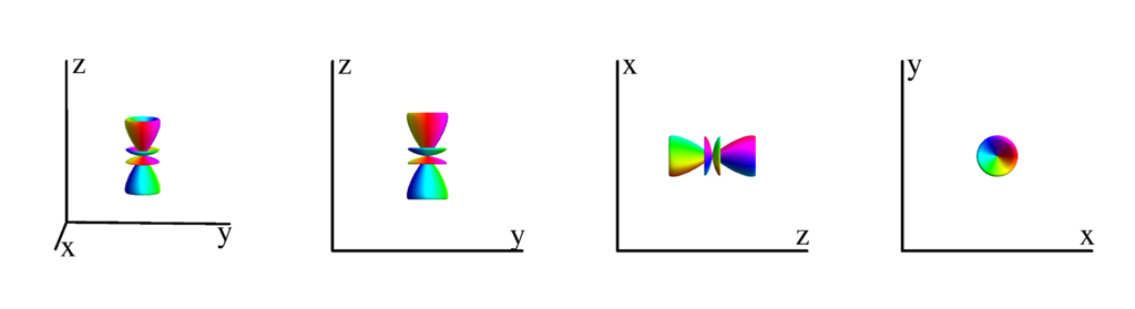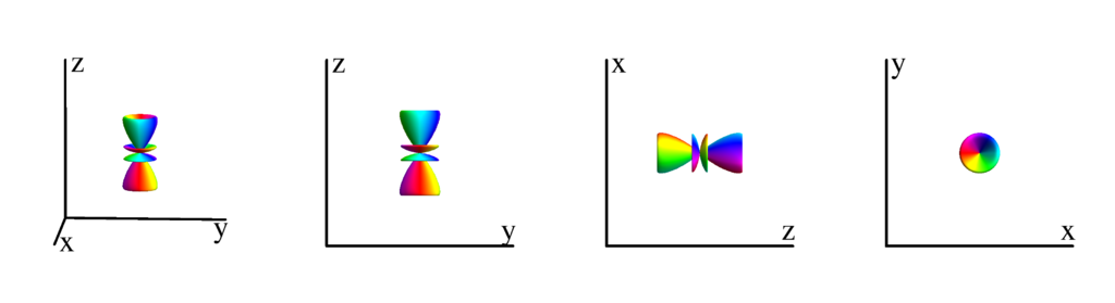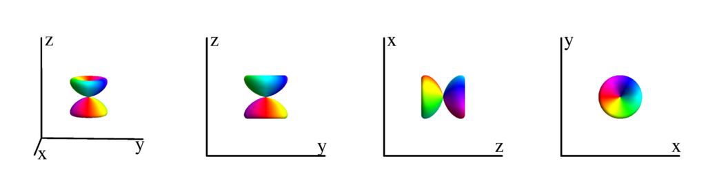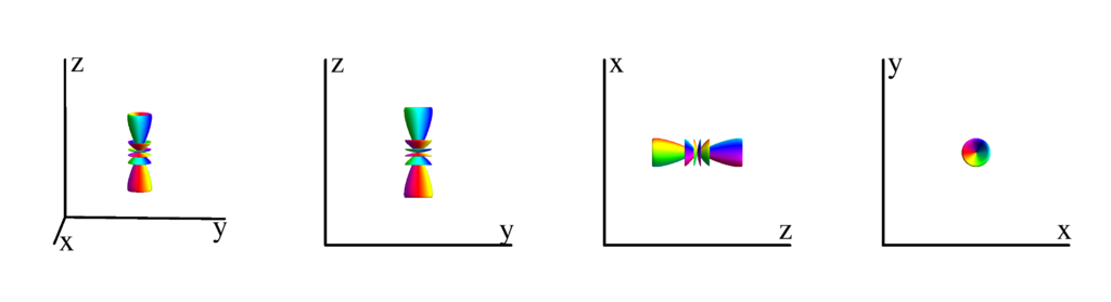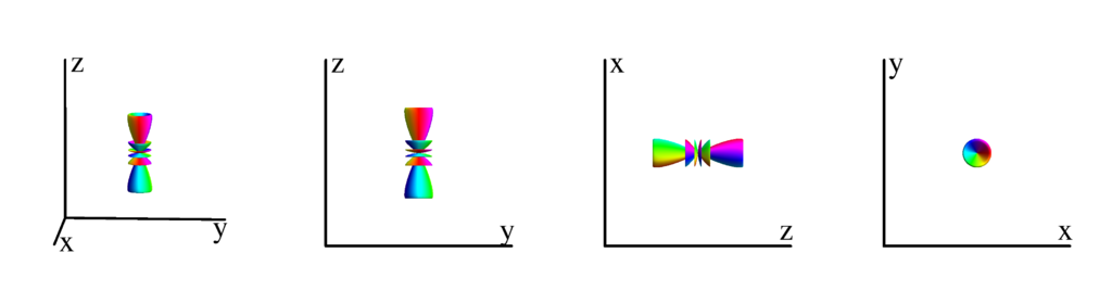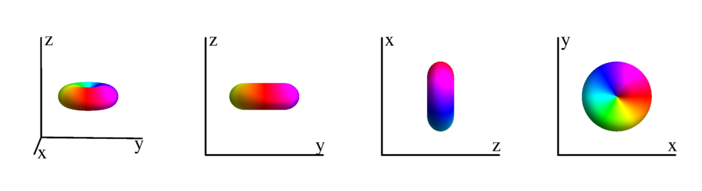 The following table shows the spherical harmonics up to $l=6$. We list both the explicit function in terms of the angular coordinates $\theta$ and $\phi$ as well as the function in terms of the directional cosines $x$, $y$ and $z$. Using a right hand coordinate system the relation is: $x=\cos(\phi)\sin(\theta)$, $y=\sin(\phi)\sin(\theta)$ and $z=\cos(\theta)$. The plots show the surface defined by the equation $r={Y_l^{(m)}}^* Y_l^{(m)}$. The color of the surface is according to the phase with red for positive, cyan for negative, a mixture of yellow and green for pure positive imaginary values and a mixture of blue and magenta for pure negative imaginary values. We show a 3D image as well as a projection along the $x$, $y$ and $z$ direction.