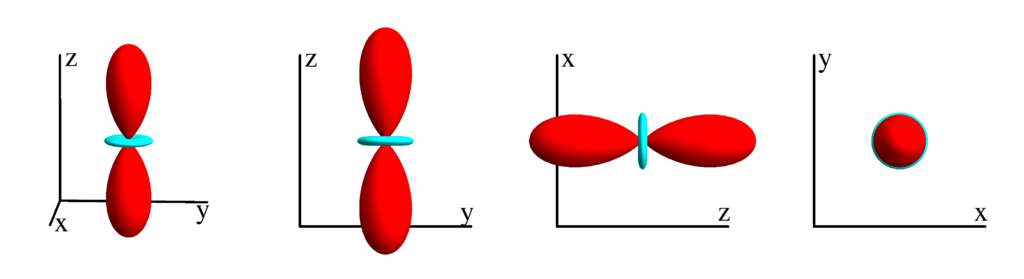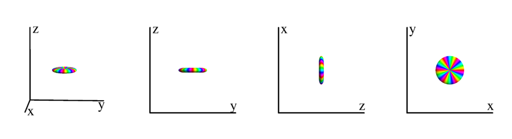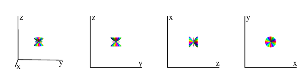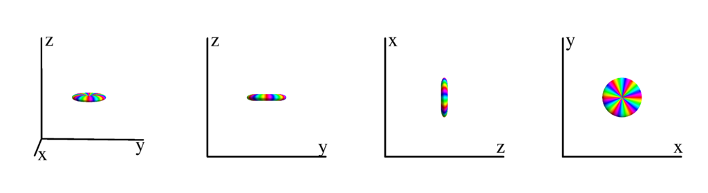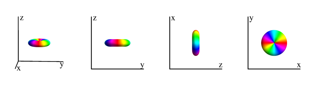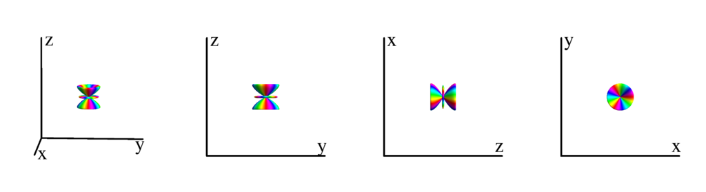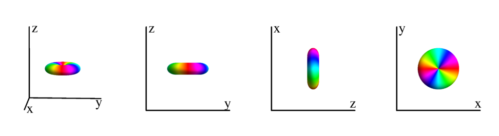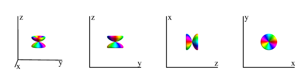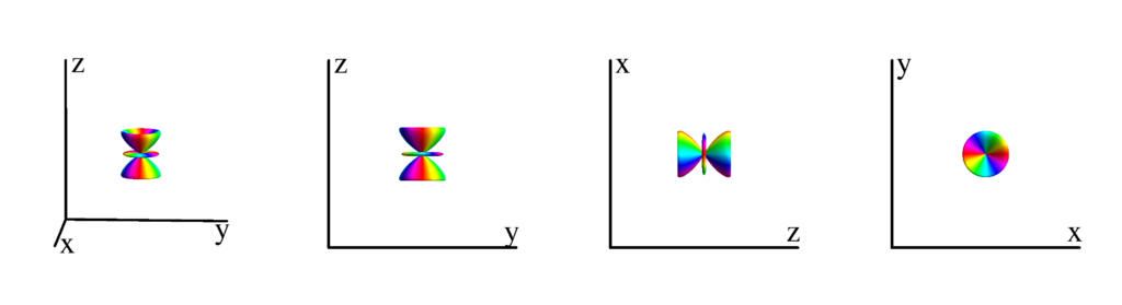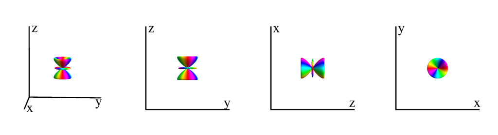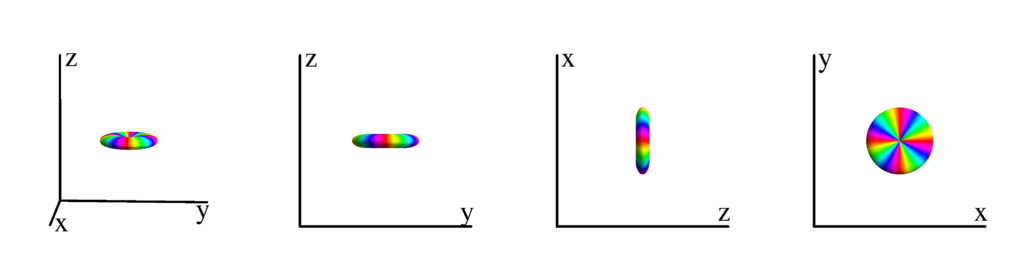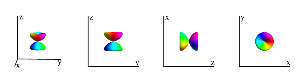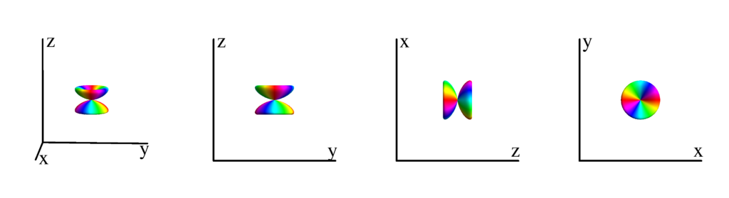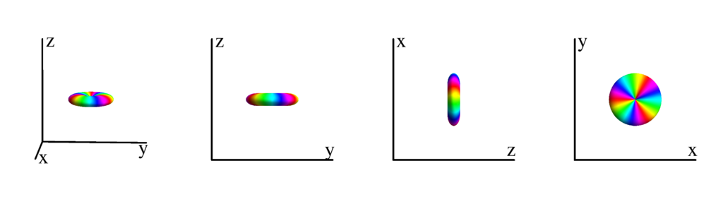 The following table shows the spherical harmonics up to $l=6$. We list both the explicit function in terms of the angular coordinates $\theta$ and $\phi$ as well as the function in terms of the directional cosines $x$, $y$ and $z$. Using a right hand coordinate system the relation is: $x=\cos(\phi)\sin(\theta)$, $y=\sin(\phi)\sin(\theta)$ and $z=\cos(\theta)$. The plots show the surface defined by the equation $r={Y_l^{(m)}}^* Y_l^{(m)}$. The color of the surface is according to the phase with red for positive, cyan for negative, a mixture of yellow and green for pure positive imaginary values and a mixture of blue and magenta for pure negative imaginary values. We show a 3D image as well as a projection along the $x$, $y$ and $z$ direction.