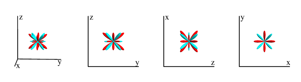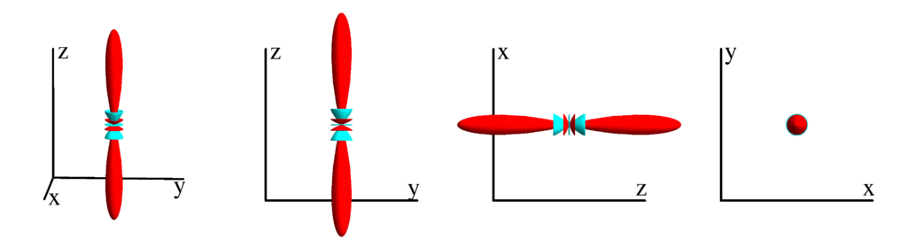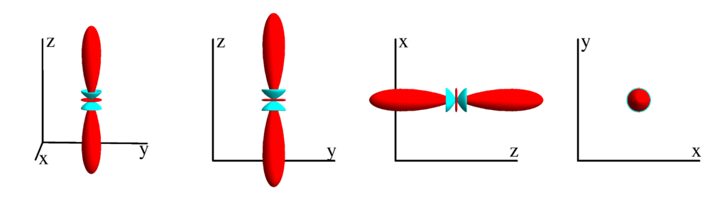 The following table shows the tesseral harmonics up to $l=6$. We list the explicit function in terms of the directional cosines $x$, $y$ and $z$. The plots show the surface defined by the equation $r={Z_l^{(m)}}^* Z_l^{(m)}$. The color of the surface is according to the phase with red for positive and cyan for negative. We show a 3D image as well as a projection along the $x$, $y$ and $z$ direction.