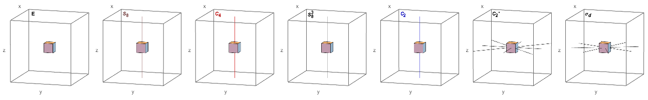 $ $ $ \text{E} \,{\text{(1)}} $ $ S_8 \,{\text{(2)}} $ $ C_4 \,{\text{(2)}} $ $ S_8^3{} \,{\text{(2)}} $ $ C_2 \,{\text{(1)}} $ $ C_2' \,{\text{(4)}} $ $ \sigma_d \,{\text{(4)}} $